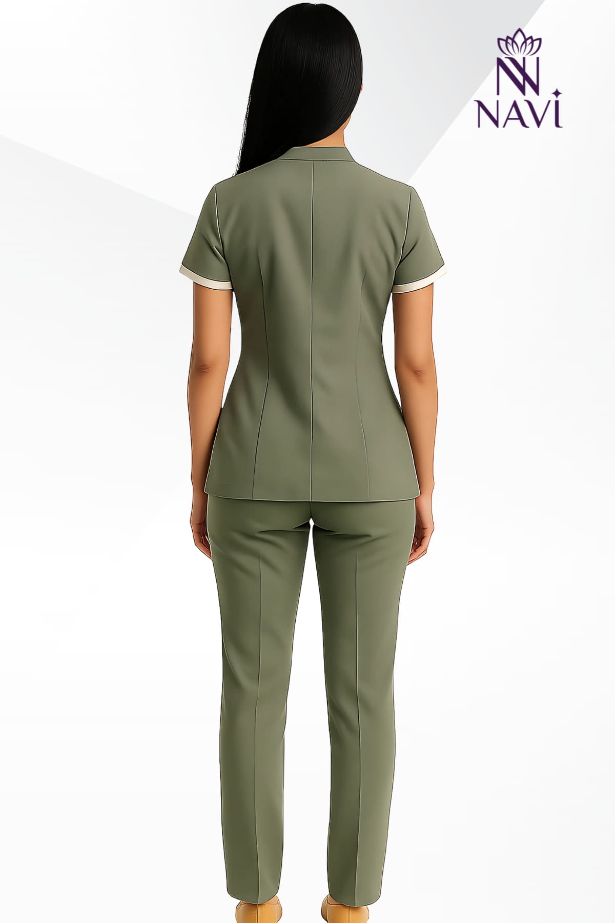 Bộ scrubs nữ olive phối viên NAVI là lựa chọn tinh tế trong mắt khách hàng trong cái nhìn đầu tiên. Bộ đồng phục mang phong cách hiện đại, tối giản nhưng vẫn giữ được khí chất riêng cho người mặc. Đặc biệt là trong môi trường spa, phòng khám và thẩm mỹ viện.