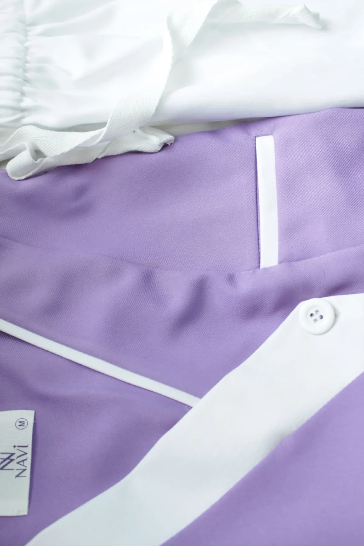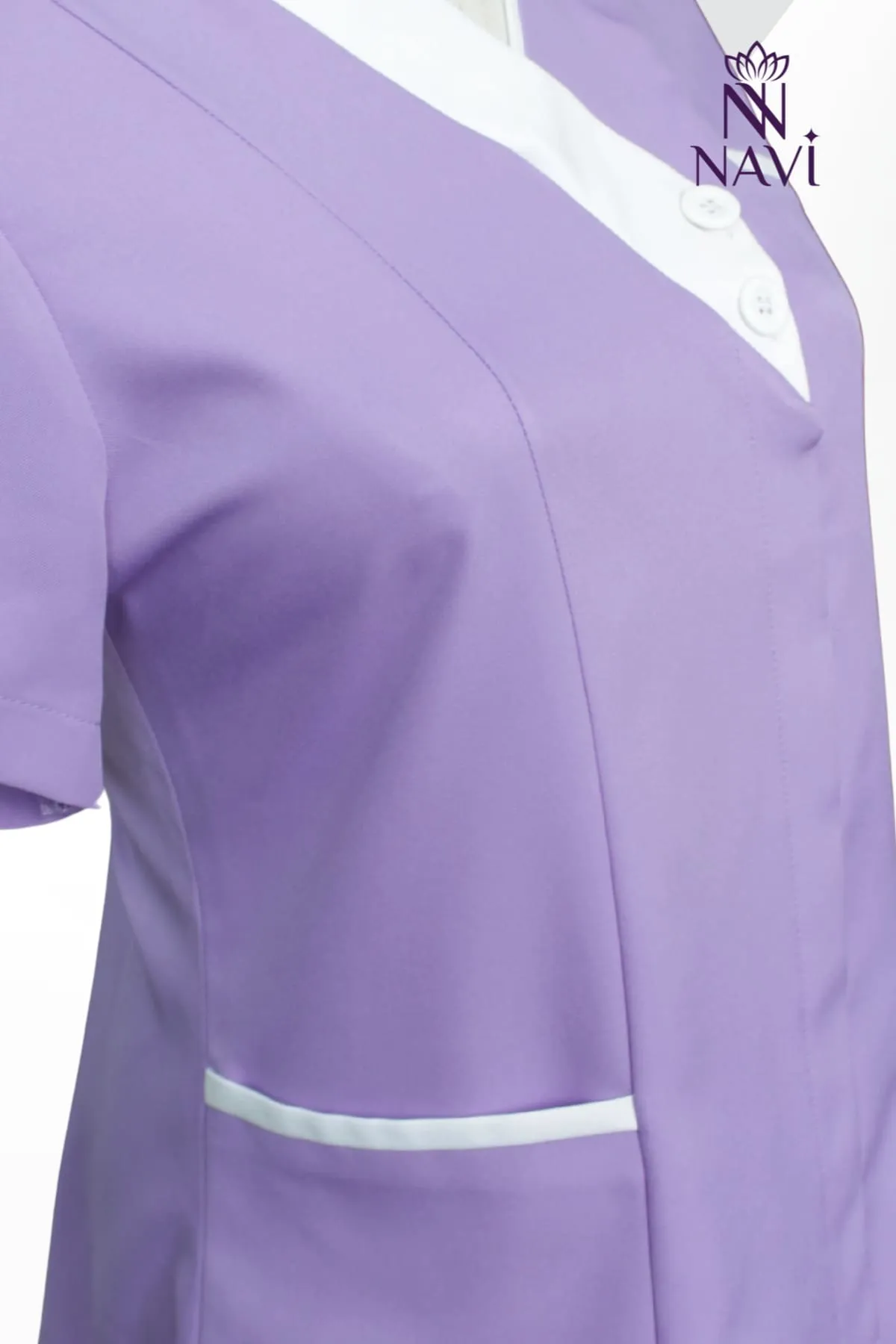 - Cổ V phối trắng nhẹ nhàng: Bộ scrubs tím phối viền tạo điểm nhấn thanh lịch, dễ mặc – dễ cởi, không kén dáng.