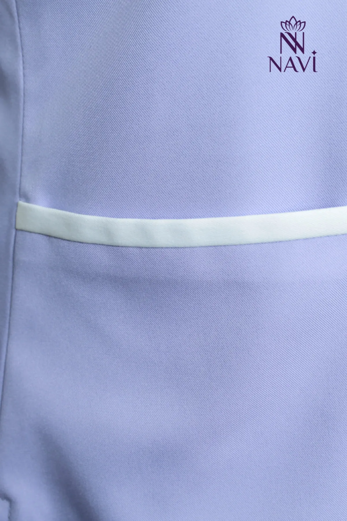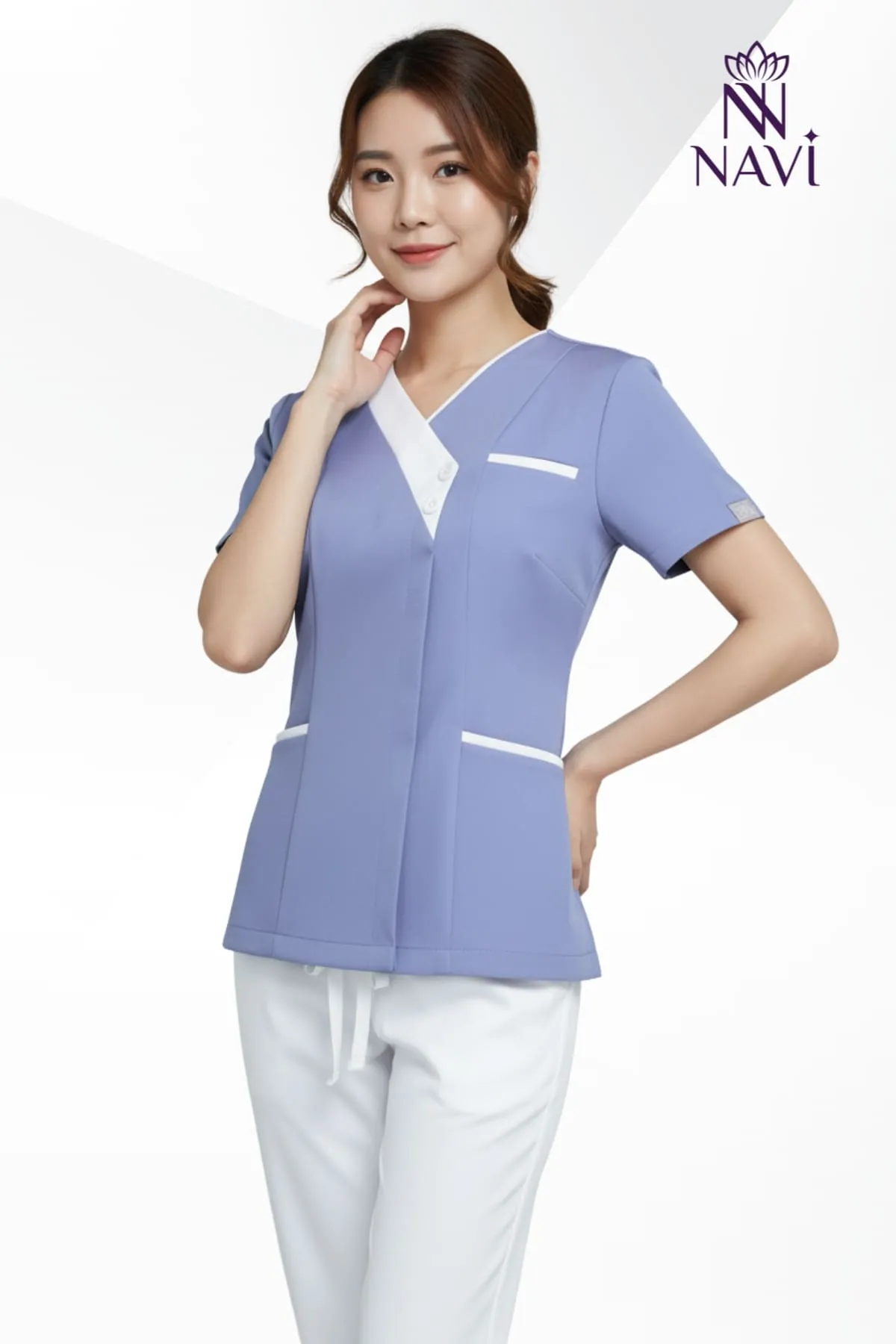 - Cổ V phối trắng nhẹ nhàng: Bộ scrubs tím phối viền tạo điểm nhấn thanh lịch, dễ mặc – dễ cởi, không kén dáng.