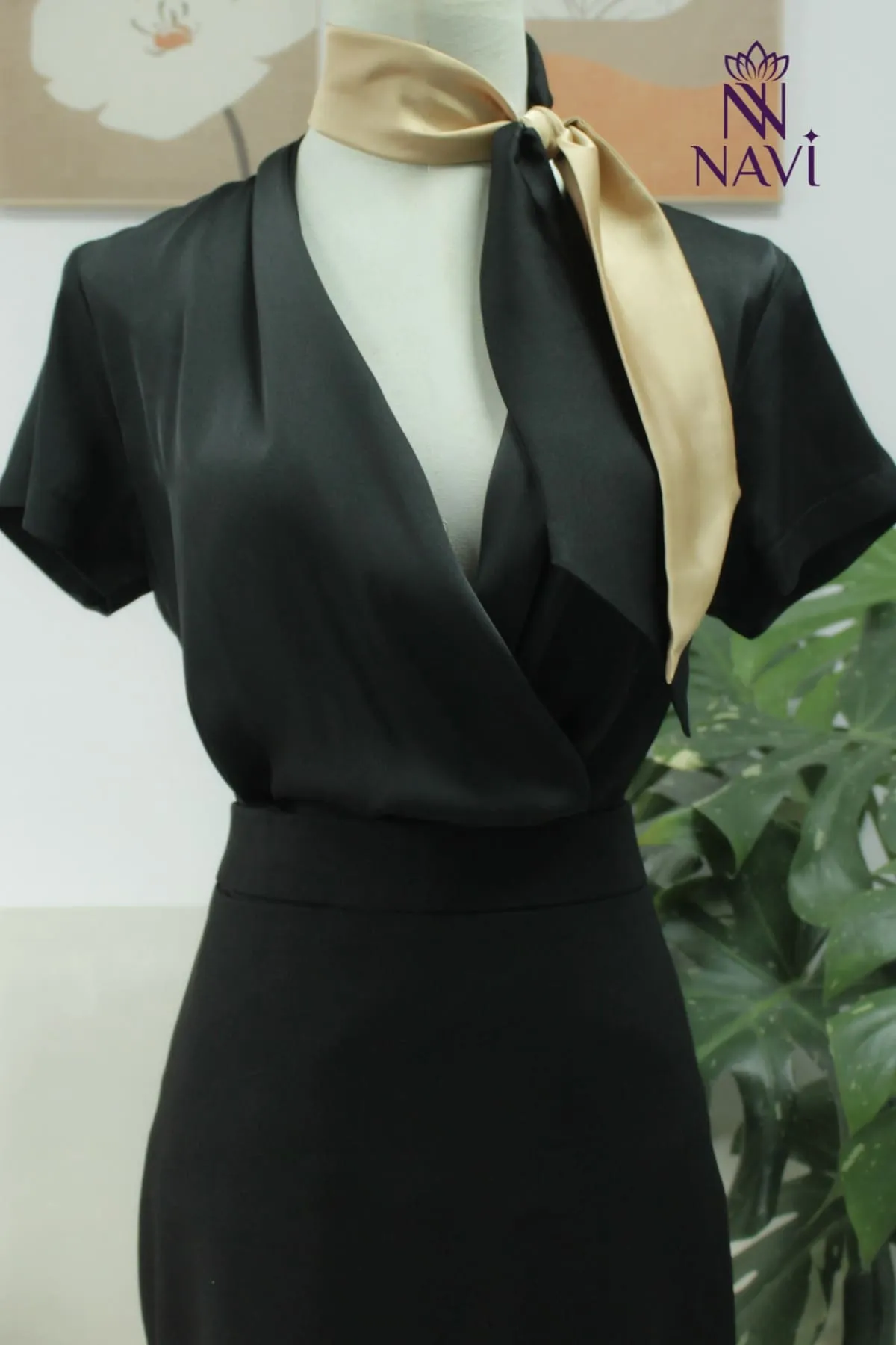 - Màu sắc: Đen sang trọng, phối khăn lụa vàng champagne.