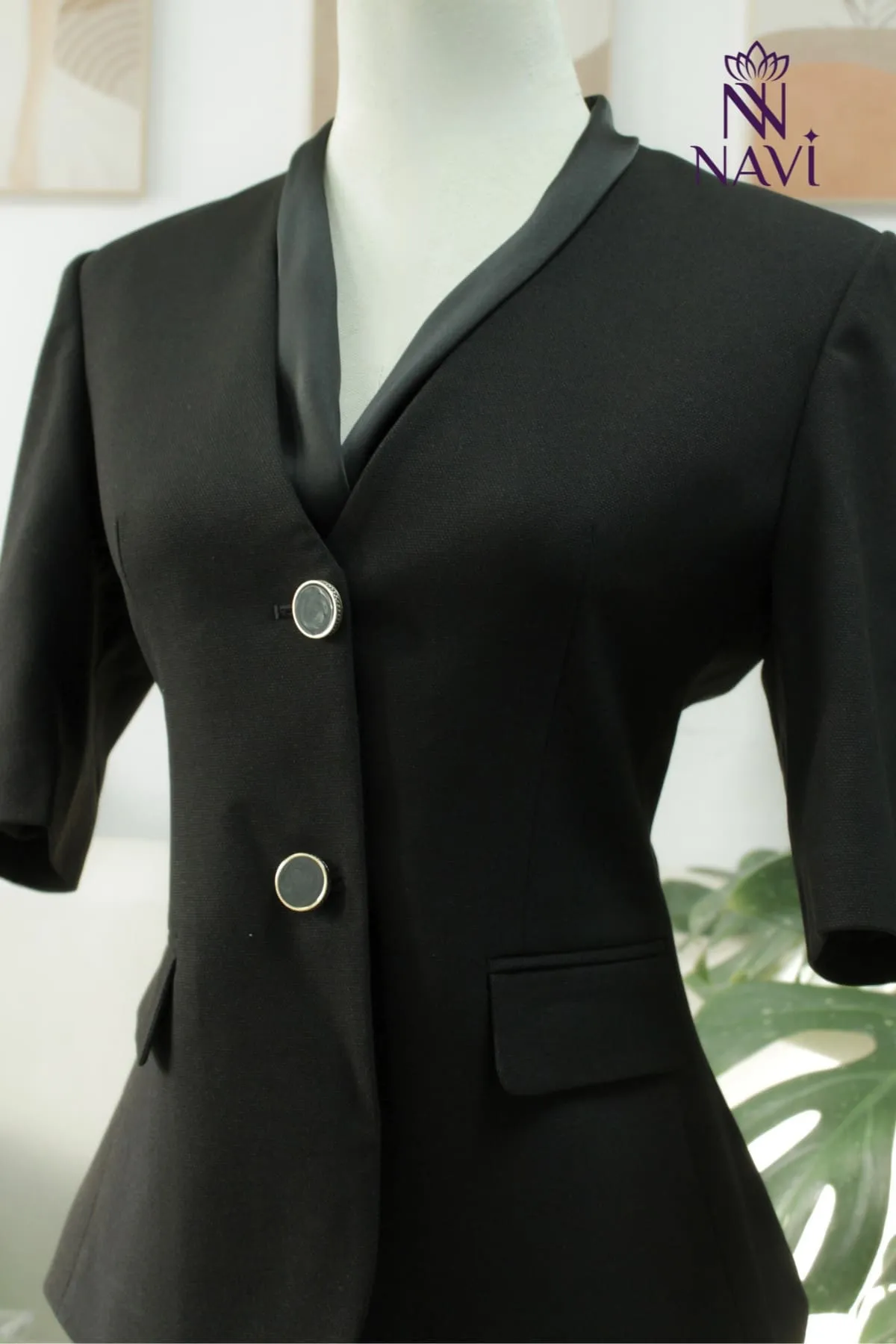 - Thiết kế cổ đắp chéo tinh tế: Dáng cổ giao nhau tạo điểm nhấn mềm mại, phù hợp cho không gian dịch vụ cao cấp, giúp gương mặt sáng và thanh thoát hơn.