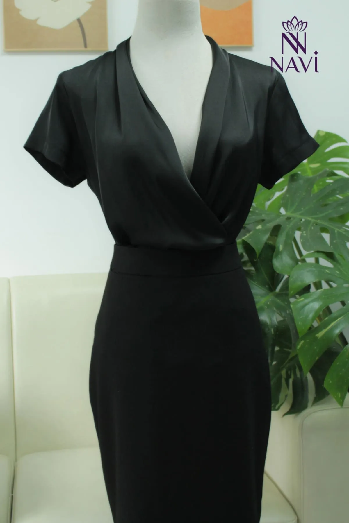 - Kiểu dáng: Áo cổ đắp chéo tay ngắn + chân váy dài ôm dáng.